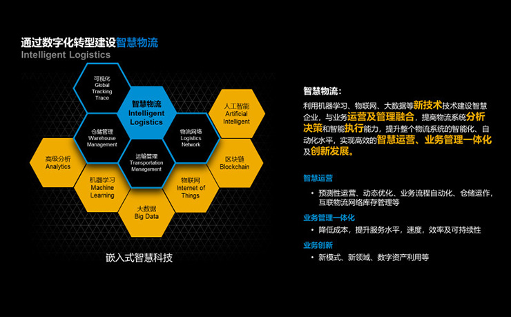 建設智慧物流。利用創(chuàng)新技術(shù)建設智慧企業(yè),提高物流系統(tǒng)分析決策和智能執(zhí)行能力,提升行業(yè)智能化、自動化、柔性水平,實現(xiàn)業(yè)務管理一體化及創(chuàng)新發(fā)展。
