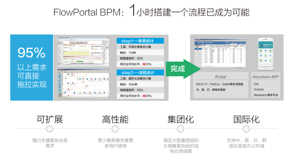 FlowPortal. net具有方便、易用和可擴展的特性,一方面在FlowPortal. net中流程、表單、報表一切設(shè)計皆是可視化免編程的,另一方面FlowPortal. net采用微軟.net技術(shù)做為流程和表單的基礎(chǔ)技術(shù),具有良好的開放性、可擴展性和彈性,是企業(yè)進行業(yè)務(wù)流程管理的理想戰(zhàn)略平臺。